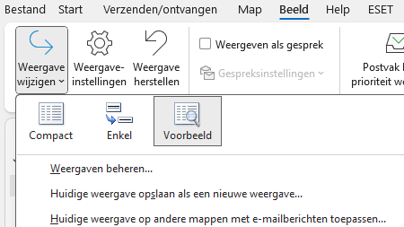 Hoeveel e-mails zie jij op je scherm? En welke informatie zie je precies? Je bepaalt dit zelf op tabblad Beeld bij “Voorbeeld van bericht”. Hoeveel regels/lijnen wil jij zien?