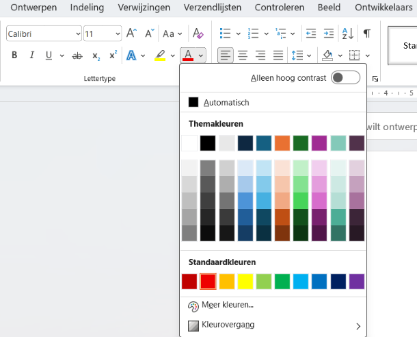 Ga ik naar de plek waar ik de tekstkleur kan wijzigen (op tabblad Start bij Lettertype) kan ik direct kiezen voor mijn huisstijlkleur. De laatste twee kleuren zijn namelijk de aqua en paars uit mijn logo. Ideaal, want door deze daar toe te voegen kan ik ze supersnel kiezen, zonder te zoeken. En jij kunt dit dus ook makkelijk doen.