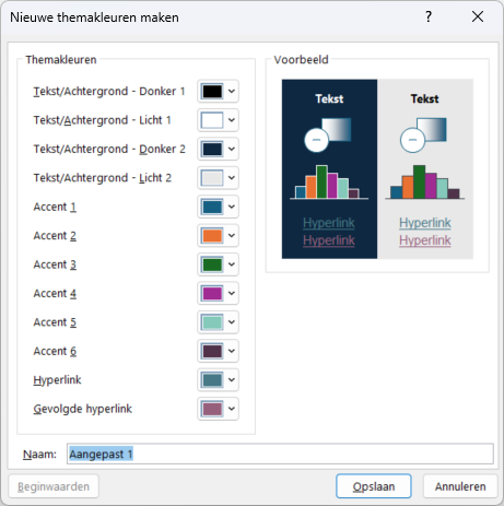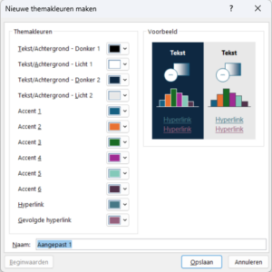 Je ziet hier 4 Tekst/Achtergrond en 6 Accentkleuren. Dat zijn de kleuren die je ook ziet als je bijvoorbeeld een tekst een kleur wilt geven, of een vorm een opvulkleur. Deze kleuren kun je zelf aanpassen. Hiervoor ga je naar de kleur die je wilt wijzigen en maak je een keuze uit de standaard kleur. Je kunt ook alle andere kleuren aanpassen.
