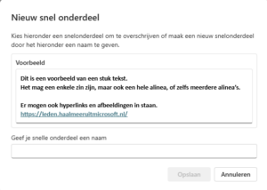 2. Typ (of plak) daar de tekst die je graag toe wilt voegen aan de Snelonderdelen. Naast tekst kunnen hier ook hyperlinks en afbeeldingen in staan.