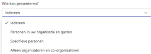 Met deze optie bepaal je wie er mensen mag toelaten uit de lobby. Dat kan nog door organisatoren, mede-organisatoren en, afhankelijk van je keuze, door de presentatoren.