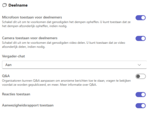 Mogen zij bijvoorbeeld de microfoon/camera aan zetten – of juist niet? Wil je de chat toestaan of juist niet?