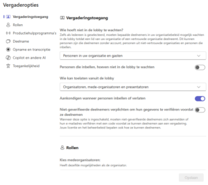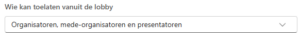 Met deze optie bepaal je wie er mensen mag toelaten uit de lobby. Dat kan nog door organisatoren, mede-organisatoren en, afhankelijk van je keuze, door de presentatoren.